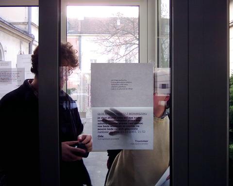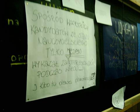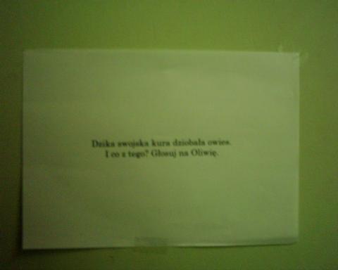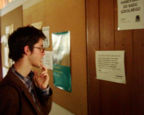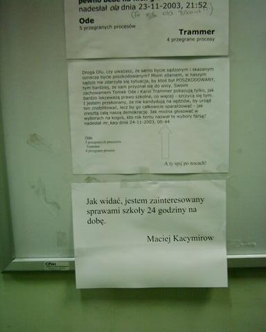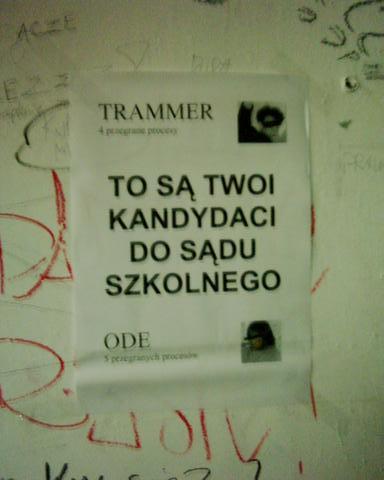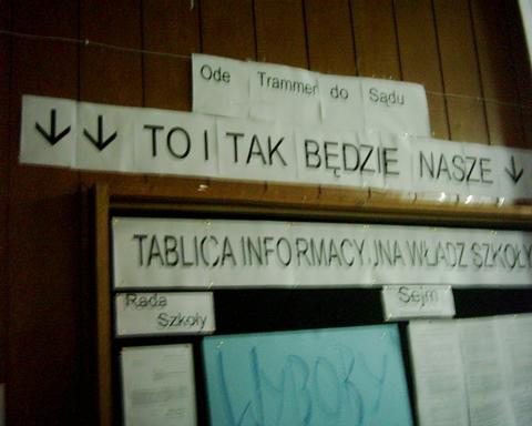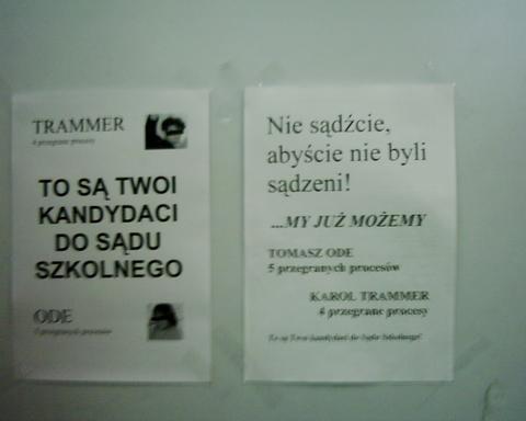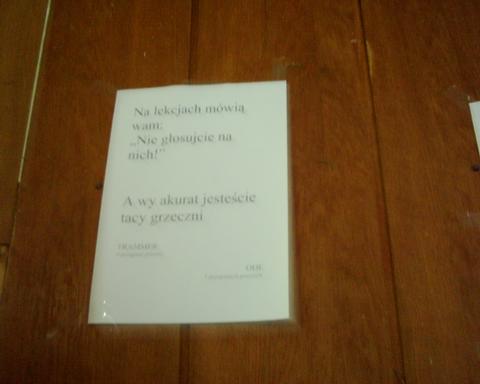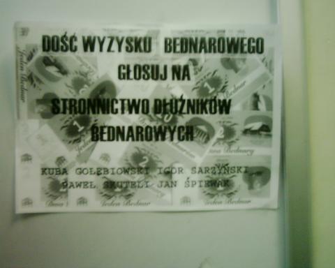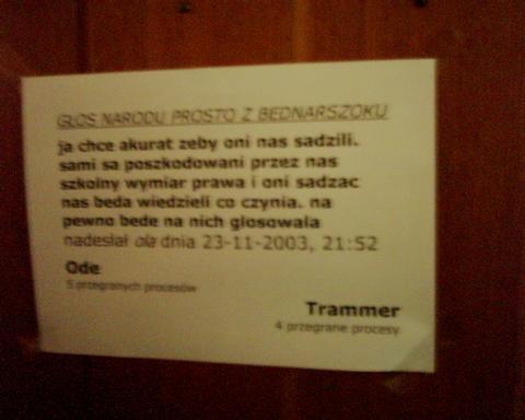 ![]() Trammer. 4 przegrane procesy. Ode. 5 przegranych procesów. Kampania kandydatów do sądu Karola Trammera i Tomka Ode opiera się głównie na kłopotach z wymiarem sprawiedliwości obu panów. ![]() Ostrzem ironii Ode i Trammer zamieniają swoją pozorną wadę w największy atut. ![]() Ich kampania jest niezwykle dynamiczna, na bieżąco reagują na aktualne wydarzenia. Tu podczas naklejania jednego z niezliczonych plakatów... ![]() ...z popierającym ich komenatrzem Oli zamieszczonym na BednarSzoku. ![]() Kandydad do sejmu Alek Temkin ogląda powyższy plakat ![]() Rozwieszenie fragmentu BednarSzokowej dyskusji spowodowalo przedłużenie jej na szkolnych ścianach. Tu: Wydrukowane i opatrzone komentarzem przez Odego i Trammera BednarSzokowe wypowiedzi Oli i Maćka Kacymirowa oraz dolepiona przez Maćka Kacymirowa odpowiedź. ![]() Na lekcjach mówią wam: "Nie głosujcie na nich!". Karol i Tomek zarzucają niektórym nauczycielom stonniczość. ![]() Ale największe wrażenie w kampanii obu panów robi ogromny napis wywieszony nad tablicą informacyjną władz szkolnych, który górował podczas wiecu ponad wszystkimi kandydatami. ![]() Dość wyzysku bednarowego. Kampania Stronnictwa Dłużników Bednarowych skierowana jest w system bednarowy. ![]() Przyszłość w waszych rękach. Młody Kordelier pragnie budować społeczeństwo obywatelskie, zachęca do tego plakatem z grafiką Wojtka Urbańskiego. ![]() Dzika swojaka kura dziobała owies. I co z tego?. Oliwia próbuje zaskoczyć potencjalny elektorat plakatami "od czapy". ![]() Sztab Wyborczy Jana Libery (kandydad do sądu) przygotowuje zaskakujący plakat, który niedługo zawiśnie na naszych ścianach. ![]() Plakat powieszony przez rozgoryczonych uczniów. Treść mówi sama za siebie.